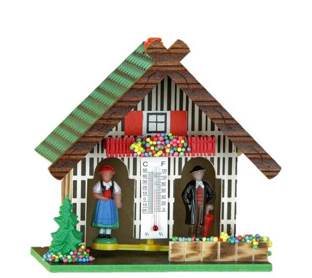 Classica cassetta segnatempo in legno colorata con i colori ad olio. Questa piccola cassetta ha posto ovunque ed è un barometro perfetto per scoprire la temperatura esterna oltre a prevedere le previsioni del tempo in base alla posizione dei due personaggi tirolesi che si trovano all'interno della casetta. La Signora esce solo se c'è il sole mentre il signore esce solo se piove. Semplice ma originale questa casetta è un bel pensierino da fare alla tua amica del cuore.