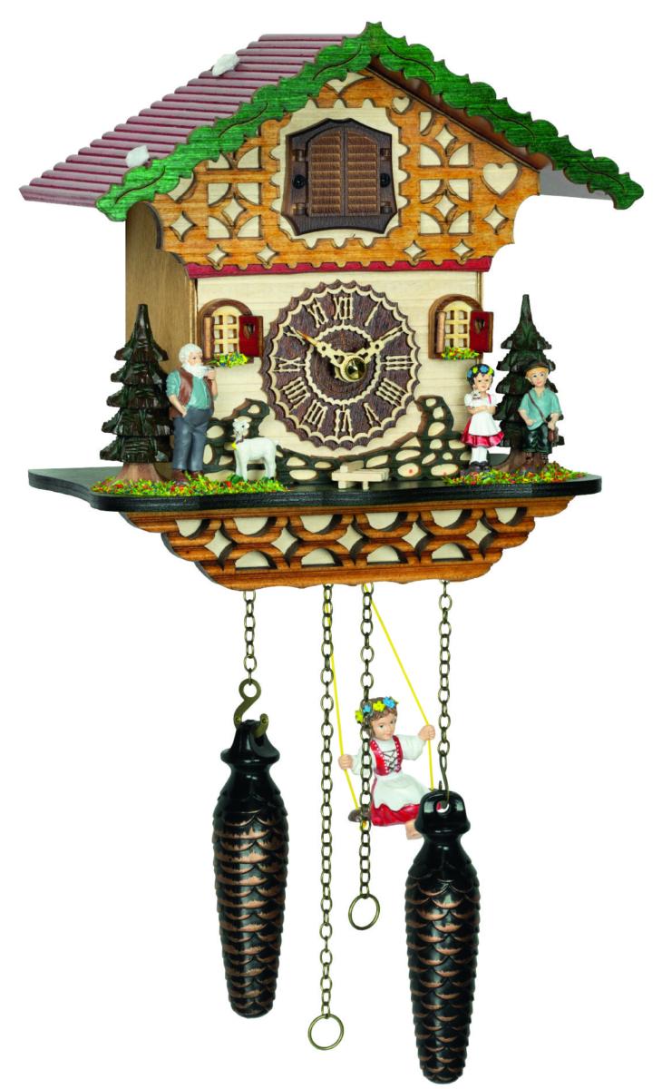 Questo orologio da parete a cucù moderno ha diversi movimenti, ovvero il cuculo che esce dalla finestrella cantando in base al numero delle ore, il taglialegna che si muove su e giù e la ruota del mulino che gira. Tutto questo accompagnato da 12 melodie diverse che sono Love Theme of the Movie, Happy Wanderer, For Elise, Swan Lake, Edelweiss, Dr.Zhivago, He was beautiful, Home sweet Home, Clementine, The Entertainer, Lorelei, Sound of SilenceL'orologio funziona semplicemente con tre batterie piccole.