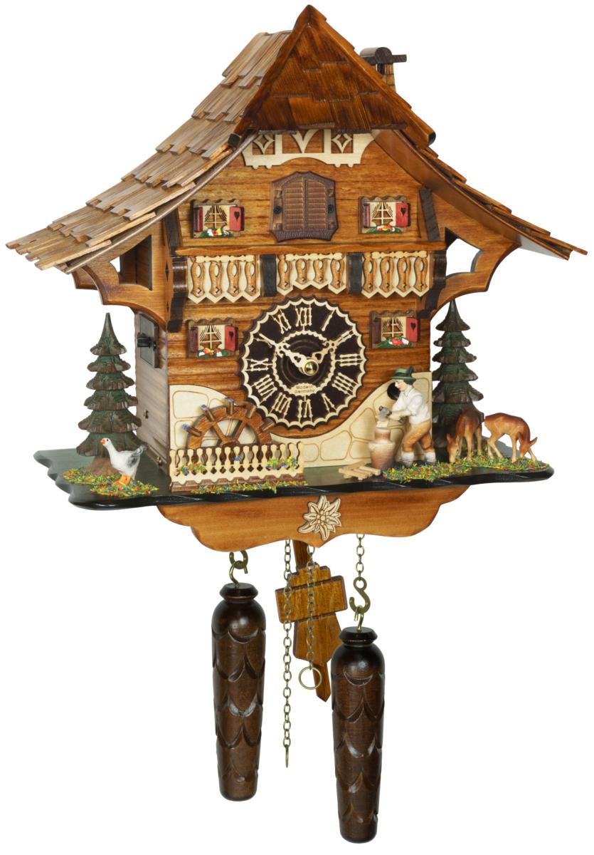 Altezza x larghezza = 42 x 38 cmMovimento al quarzo a batteria precisa al secondo - nessuna carica necessariaEfficace chiamata a cucù all'oraSpegnimento notturno automatico della chiamata a cucù tramite sensore di luceMeccanismo musicale con 12 diverse melodie che si alternano ogni oraSuono realistico dell'eco durante il richiamo del cuculoCasetta della Foresta Nera con orologio al quarzoCassa in legno massiccioVeramente artigianaleTetto con vere tegole di legnoFigure danzanti in movimentoLavorazione artigianale fatta a mano Al ritmo della musica segue la ruota del mulino gira