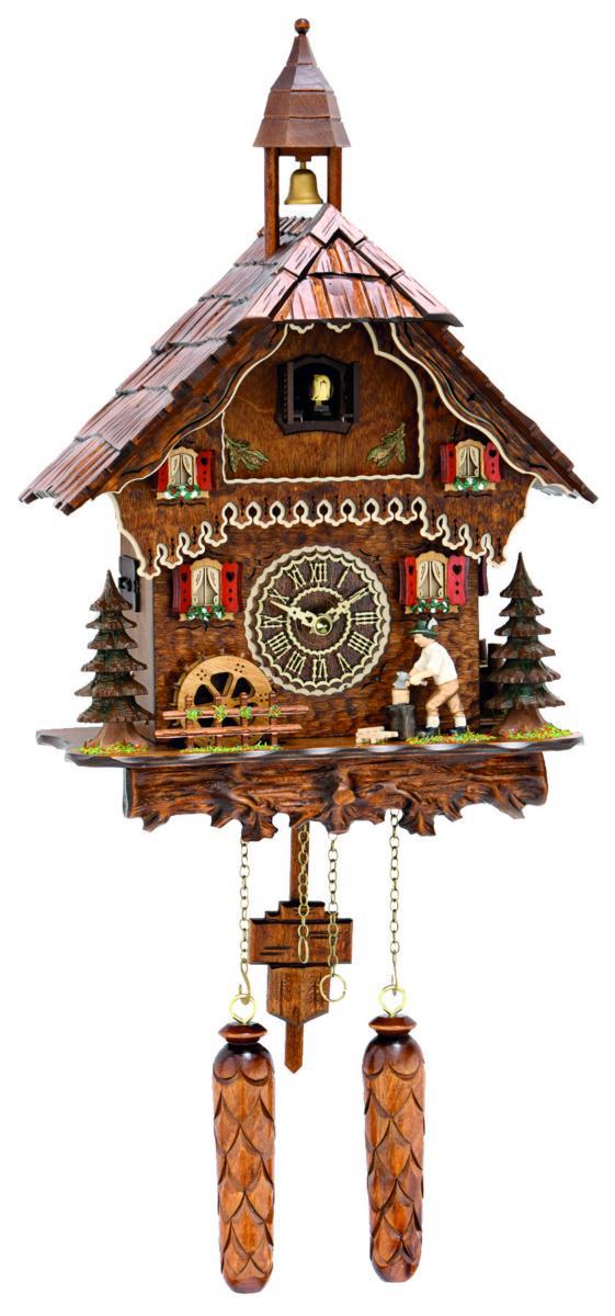 Questo bellissimo cucù al quarzo azionato da tre batterie è caratterizzato da uno spaccalegna e un mulino ad acqua che allo scoccare delle ore da il movimento al mulino e allo spaccalegna. Il cuculo cinguetta il numero delle ore e una delle 12 melodie risuona nell’ambiente. Tramite un sensore del buio il suono è automaticamente spento.Intagliato nel legno di tiglio e decorato a mano fa rivivere le tipiche baite di montagna con le imposte rosse i cuoricini e i fiori sul balcone.