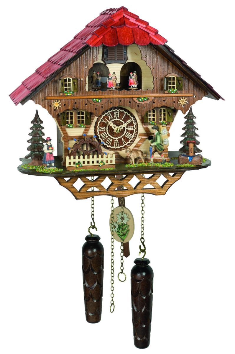 Orologio da parete a cucù è troppo bello per non averlo. Dolfi ti offre una vasta gamma di orologi a cucù in vari modelli e dimensioni a prezzi interessanti. L'orologio a cucù è un oggetto da arredamento armonioso che fa compagnia e porta allegria. Ad ogni ora che passa il cucù apre la finestrella e canta e suona melodie gioiose. La particolarità di questo orologio è che ad ogni ora la ruota del mulino gira, lo spaccalegna si muove alzando su e giù il braccio e le tre coppie di ballerini danzano sulla terrazza girando intorno. Questo orologio a cucù è automatico, funziona a batteria ed è munito di interruttore di spegnimento per le ore notturne. L'orologio è di legno come il quadrante e le lancette. Le sue dimensioni sono:Peso 3 chiliAltezza 31 cmLarghezza 34 cmProfondità 19 cm